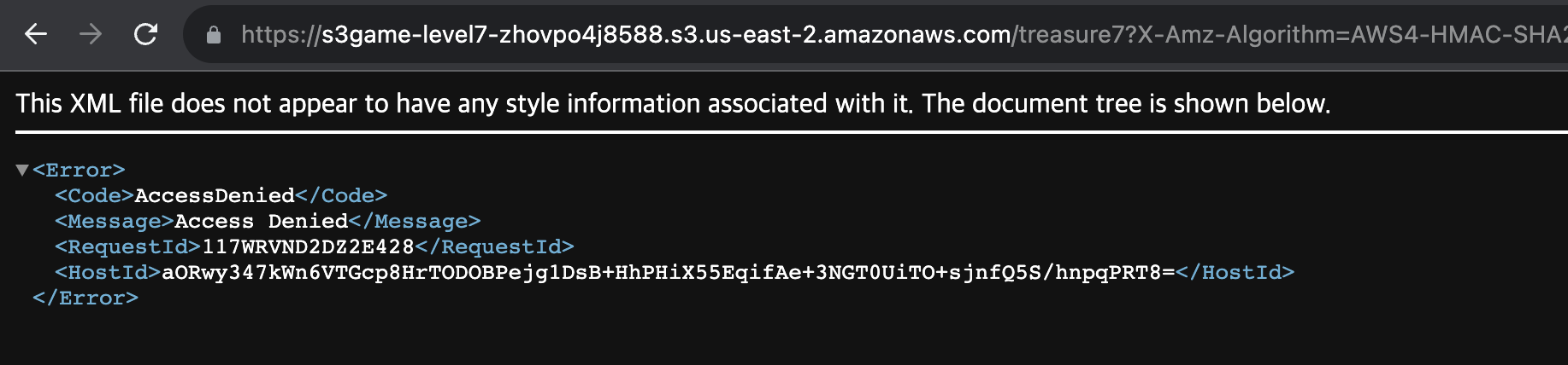 => 문제에서 제공한 bucket-name은 s3game-level2이며 treasure2를 얻을 수 있을 것이라고 했으니 object 명은 treasure2를 사용해주었고 나머지는 제공하는 style의 format에 맞게 진행했다.