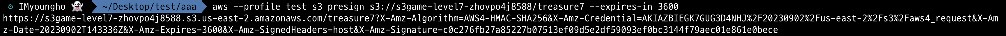 aws --profile test s3 presign s3://s3game-level7-zhovpo4j8588/treasure7 --expires-in 3600