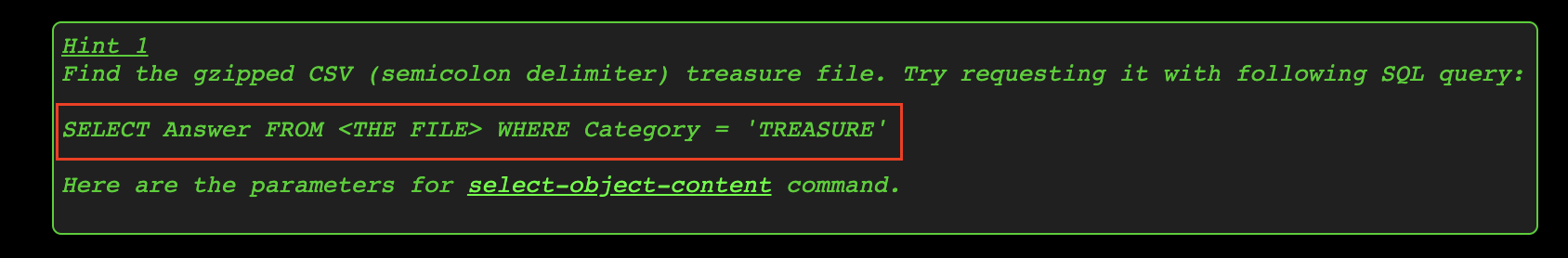 --expression "SELECT Answer FROM s3object WHERE Category = 'TREASURE'" \