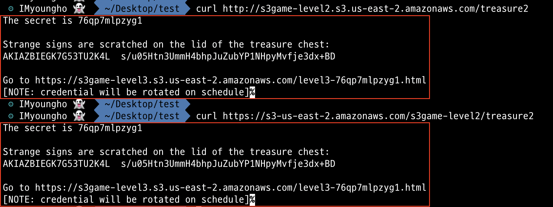 aws --profile test s3 ls s3://s3game-level4-k73045aztqln