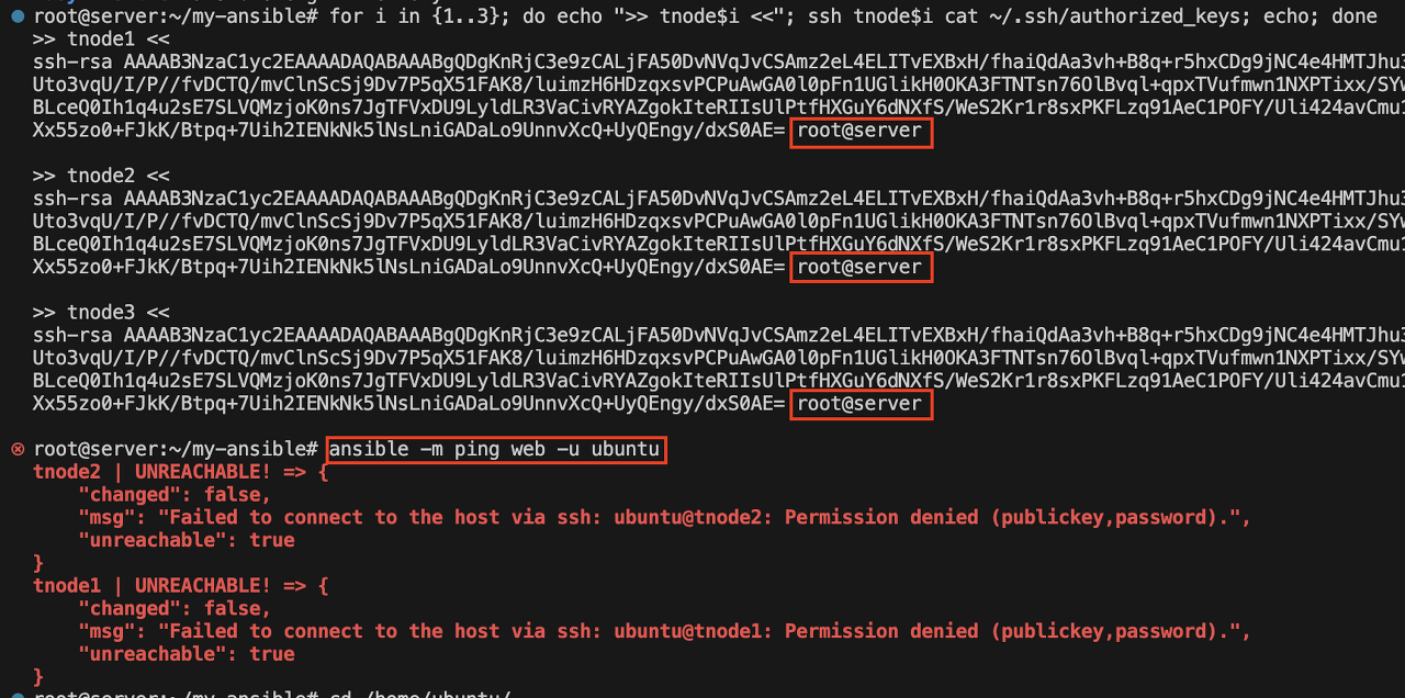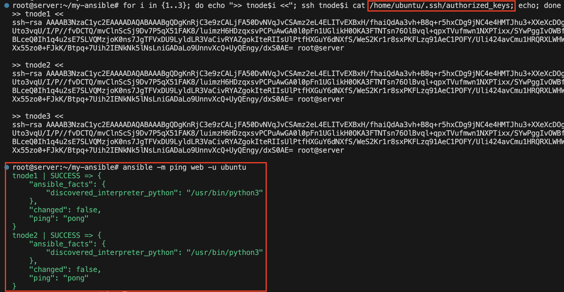 for i in {1..3}; do echo ">> tnode$i <<"; ssh tnode$i cat /home/ubuntu/.ssh/authorized_keys; echo; done